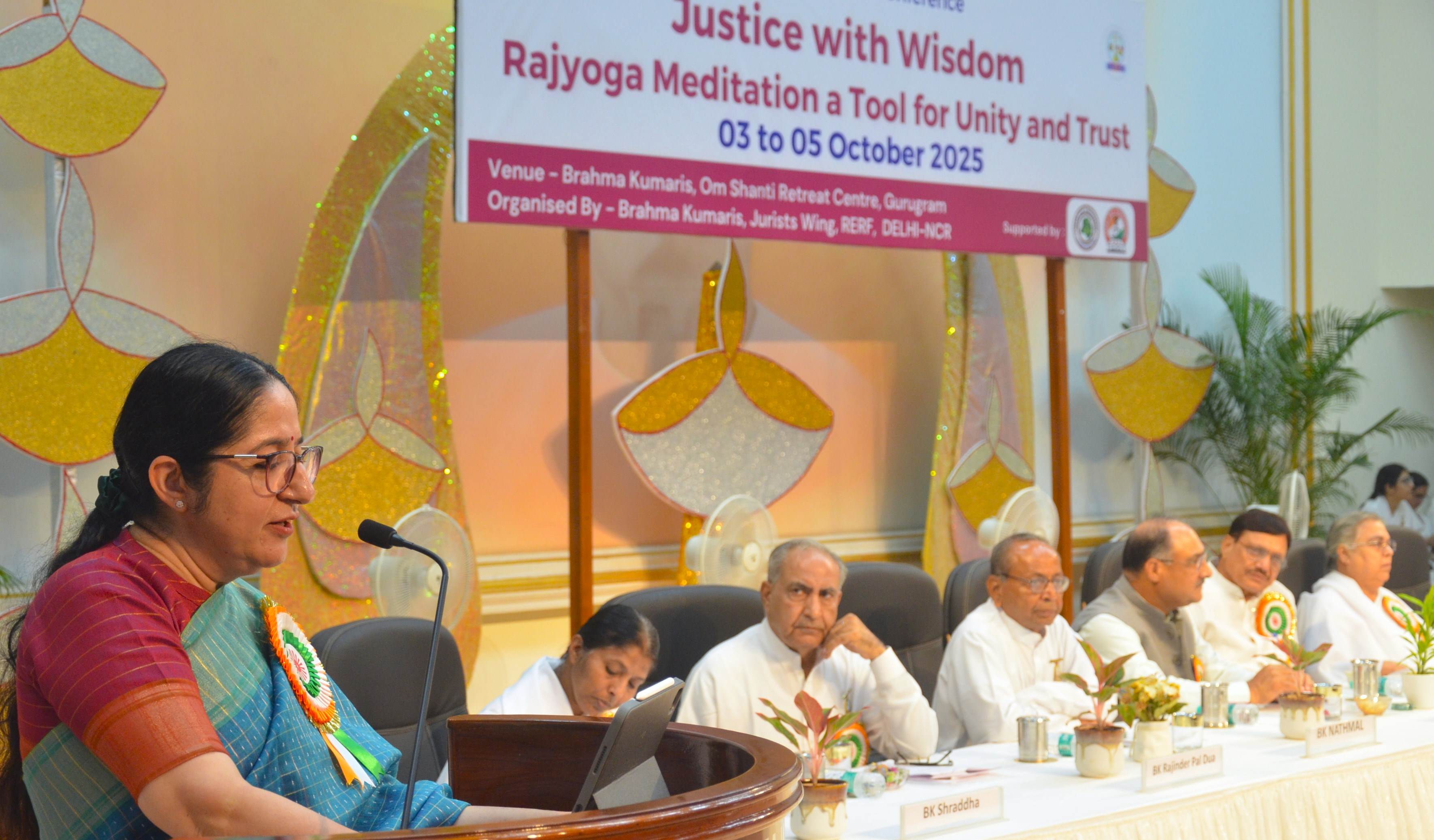 फोटो कैप्शन:09: भोराकलां, ओम शांति रिट्रीट सेंटर में संस्थान के न्यायिक प्रभाग द्वारा आयोजित सम्मेलन में बोलते हुए राजयोगिनी पुष्पा दीदी